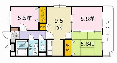 和室 5.8帖/洋室 5.8帖/洋室 5.5帖/DK 9.5帖 - 向き